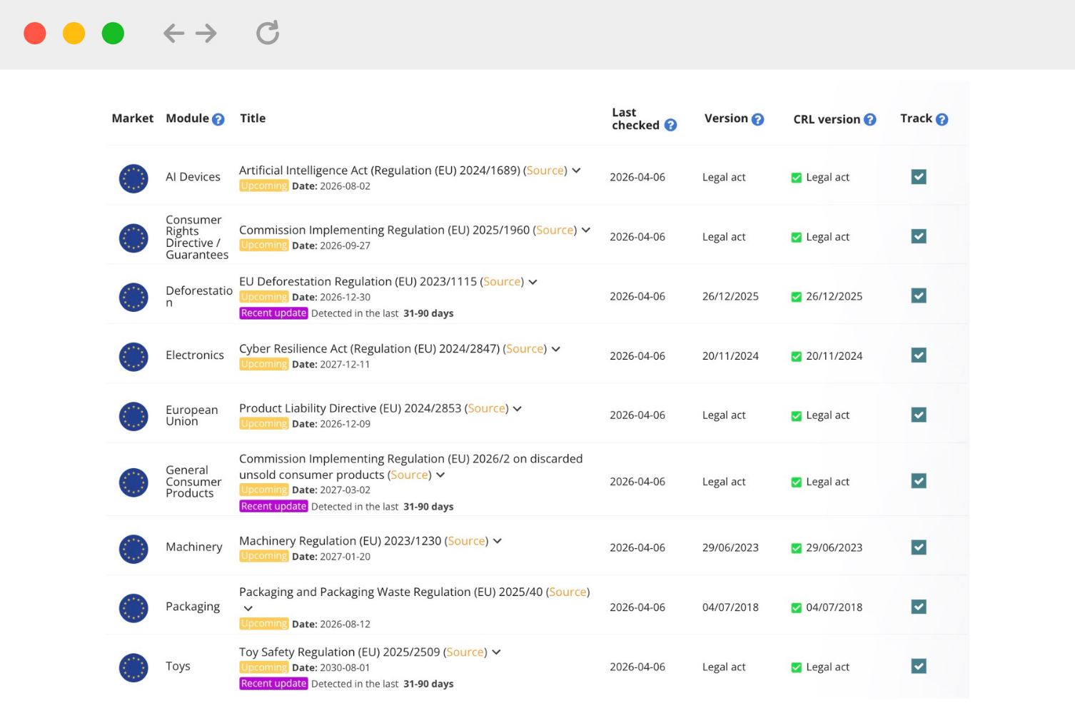 - Track new and updated regulations