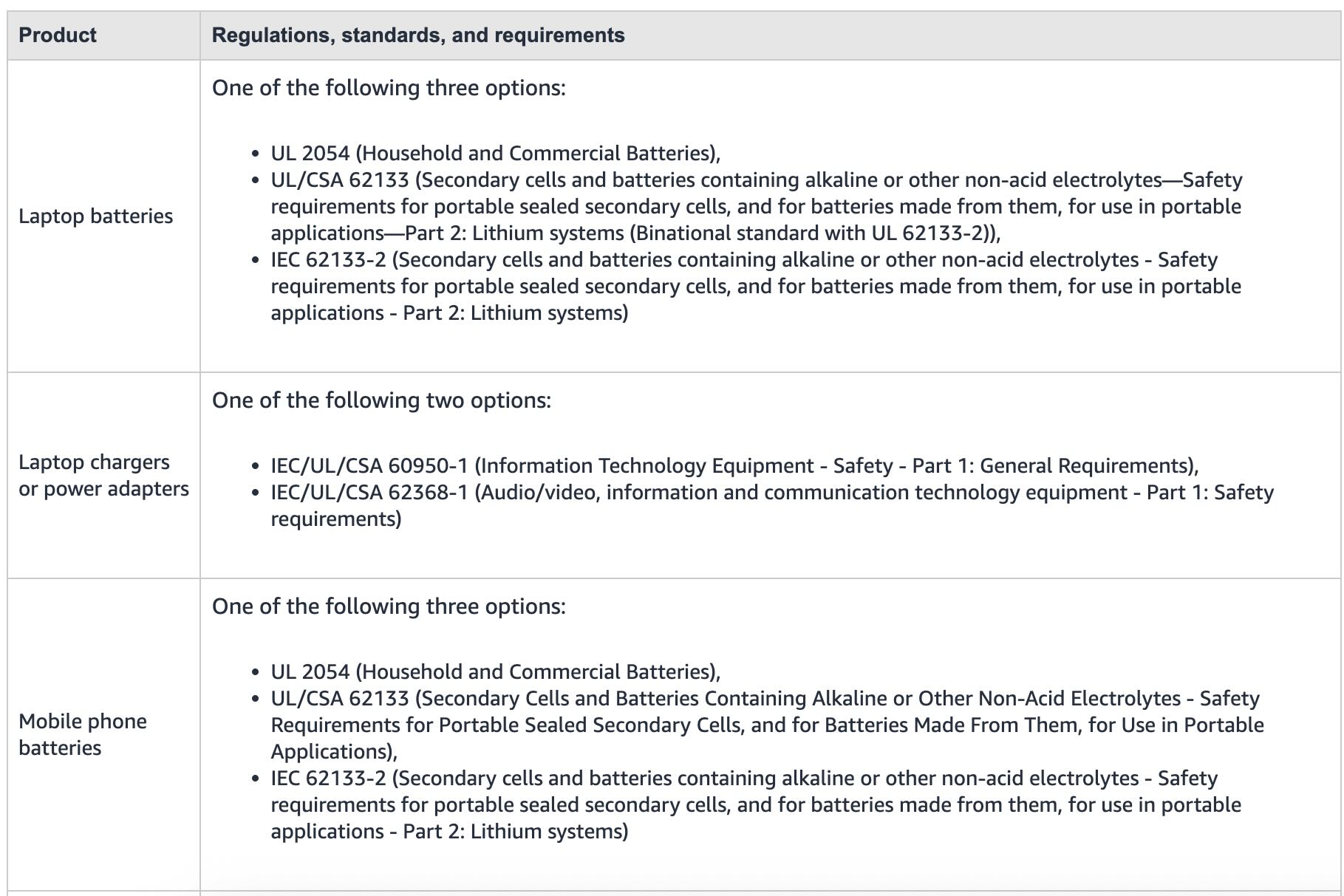 Amazon requires compliance with UL standards for certain products. Examples include lithium batteries, chargers, and other electronic devices.