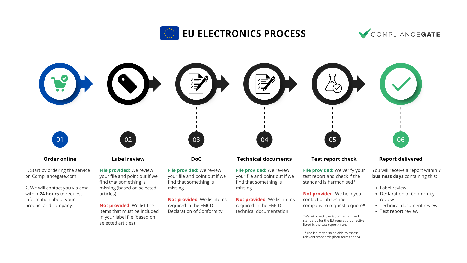 1. This service can help you understand if your label files, declaration of conformity, technical documentation, and test reports comply with certain parts of the Electromagnetic Compatibility Directive.