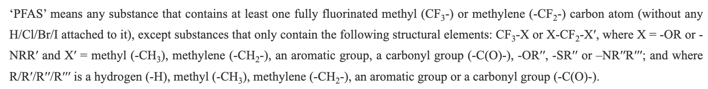 Another area of interest is that PFAS is a group of substances. Rather than listing every possible substance that may count as a PFAS, the PPWR instead provides the following definition: