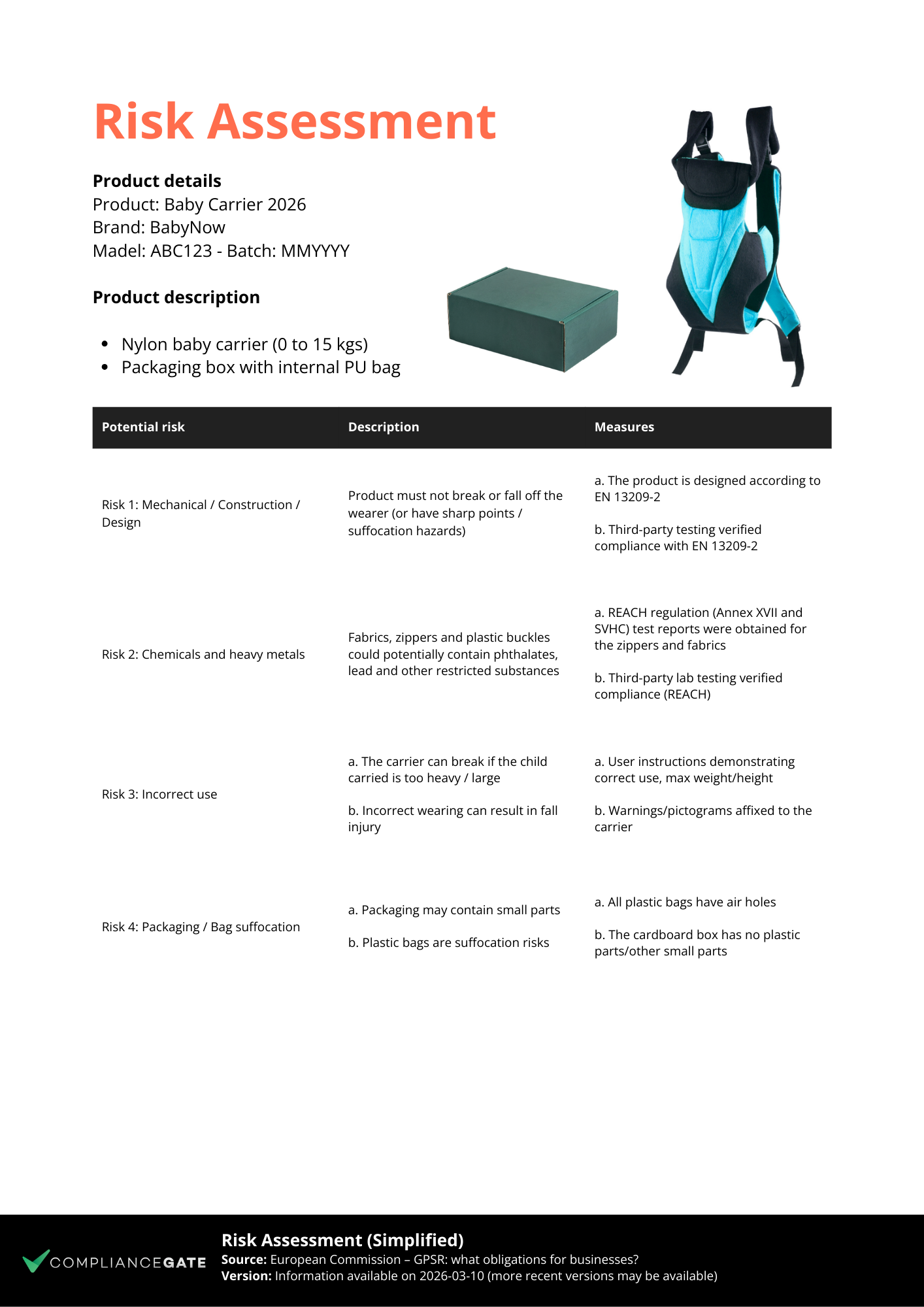 The GPSR does not provide an exact risk assessment methodology. However, a guidance document issued by the EU provides a technical documentation template that can be used to structure a GPSR risk assessment: